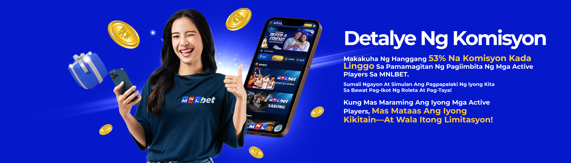 - Bilang isang Affiliate ng MNLBET, maaari kang makakuha ng hanggang 53% na komisyon batay sa bilang ng lingguhang Active Players at ang kanilang mga Net Losses